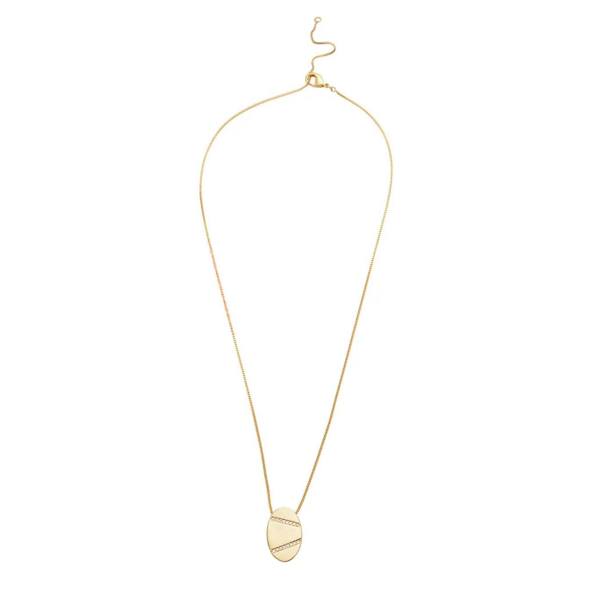 O Colar Oval Elegance tem Detalhes de Zircônias é uma joia moderna e elegante que combina formas geométricas com um toque sofisticado de brilho. Seu pingente em formato oval possui acabamento metálico espelhado e duas faixas diagonais cravejadas com micro zircônias, criando um visual contemporâneo, chique e super versátil.