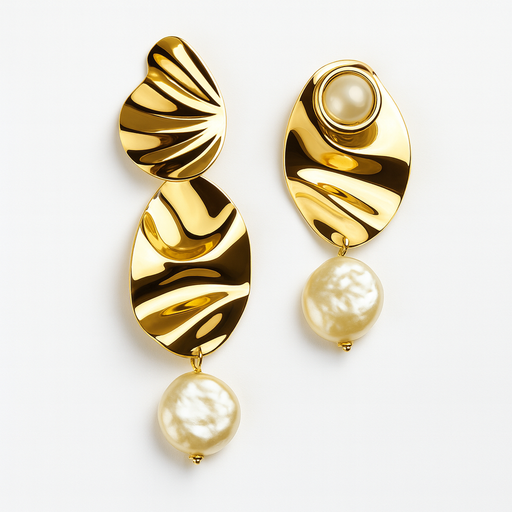 Brinco longo e assimétrico em metal dourado de alto brilho, com design orgânico e escultural. As placas douradas possuem ondulações fluidas que criam reflexos intensos e sofisticados, como se fossem esculpidas à mão. Um dos lados traz duas lâminas metálicas sobrepostas, enquanto o outro lado une uma placa única a um topo arredondado com detalhe perolado.