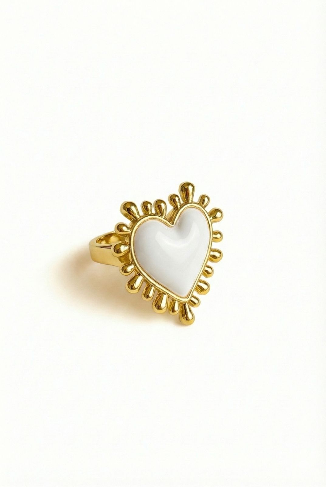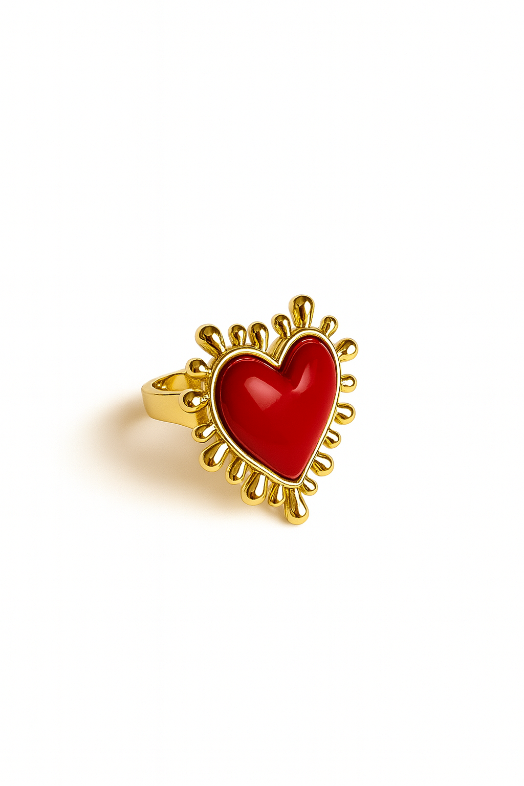 O Anel Coração Sagrado traz o vermelho intenso como centro de tudo, envolvido por um halo dourado que parece brilhar sozinho — romântico, poderoso e com aquele toque artístico que só peças statement têm.