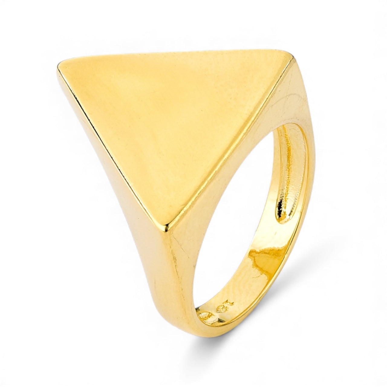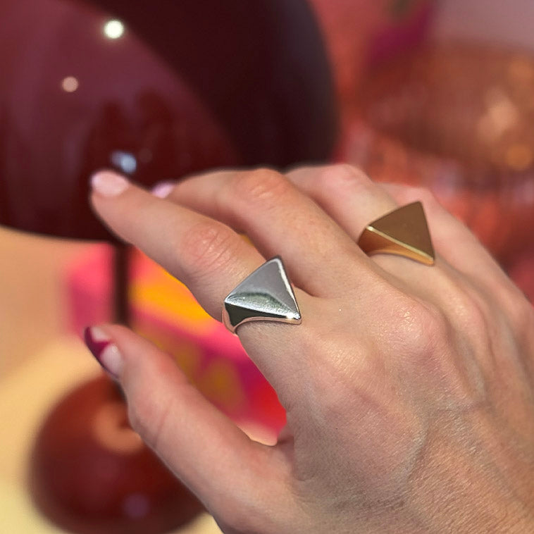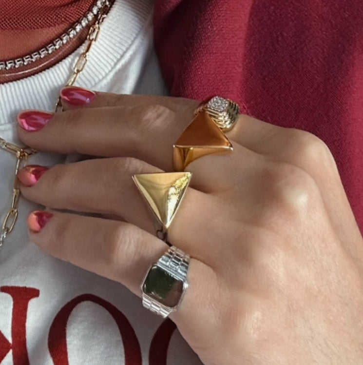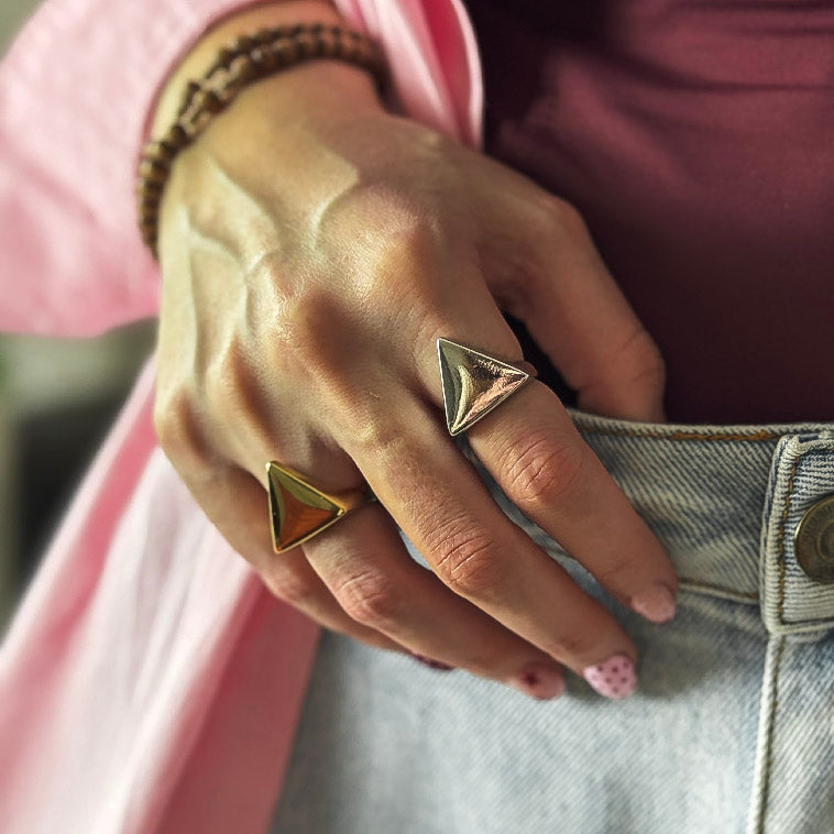 O triângulo em acabamento dourado traz uma estética moderna e arquitetônica, remetendo a força, direção e autenticidade. É uma peça limpa, bold e estilosa, perfeita para quem ama acessórios que falam por si.