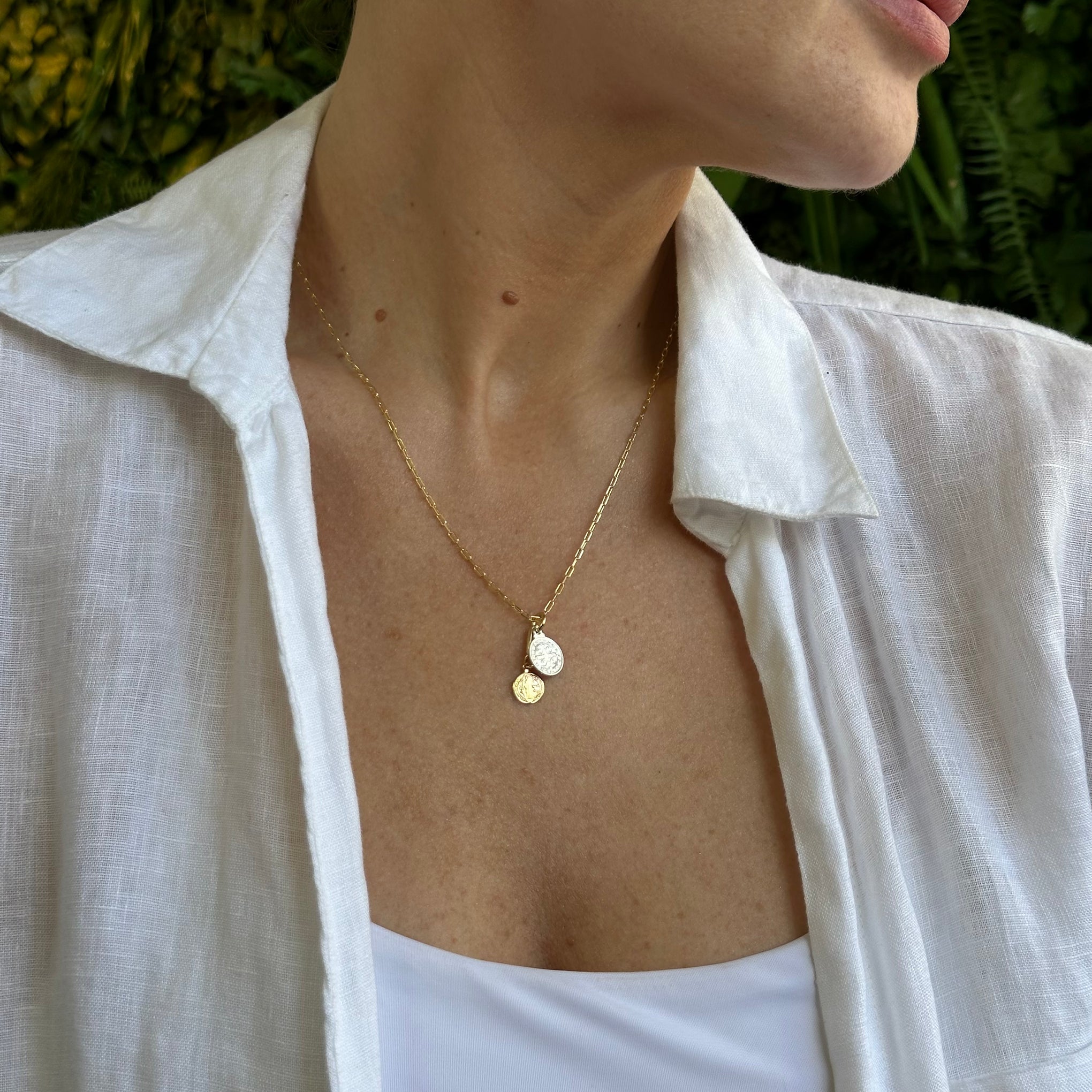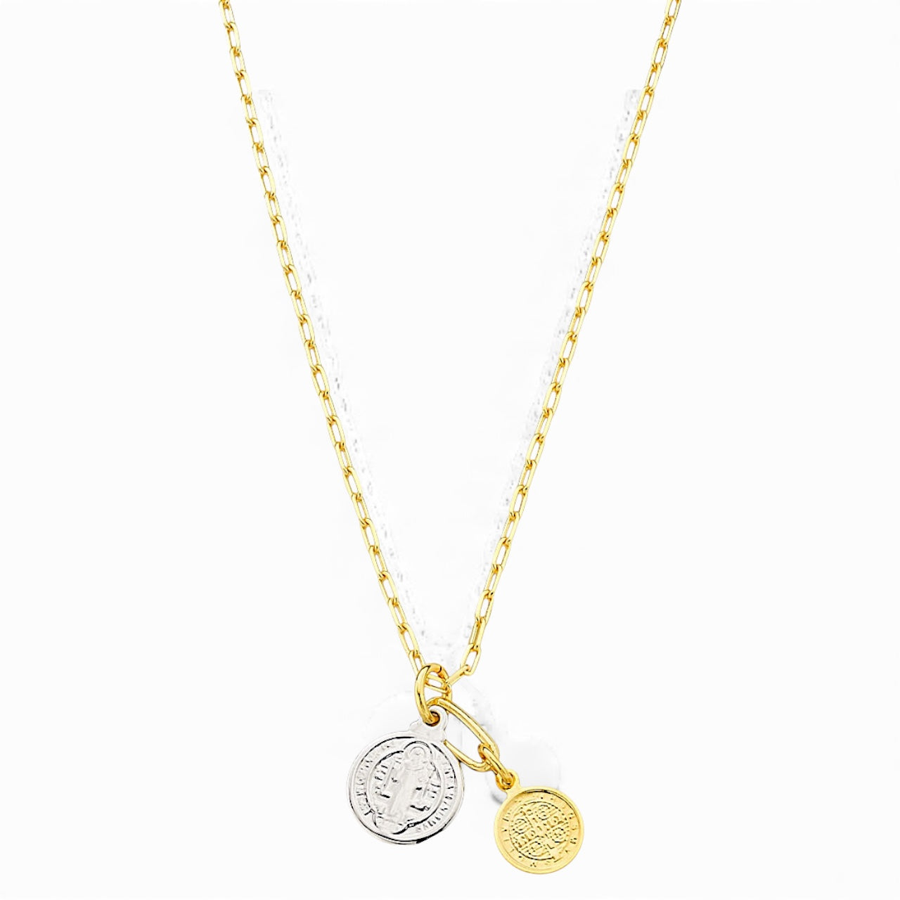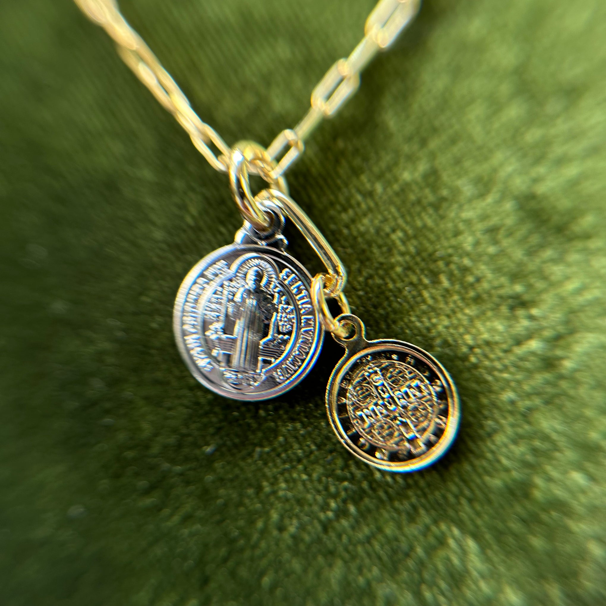 Um colar que mistura fé, estilo e personalidade. A corrente alongada em banho dourado traz um ar moderno, enquanto os dois pingentes um em prata e outro em dourado criam um contraste elegante e simbólico. Essa composição bicolor oferece um toque contemporâneo e, ao mesmo tempo, atemporal, perfeito para quem ama acessórios com significado.