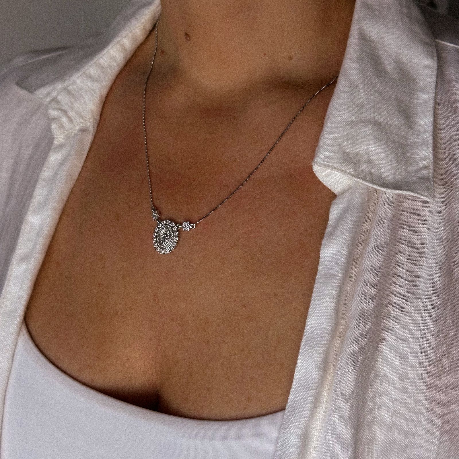 Este colar com medalha oval de Nossa Senhora das Graças é um exemplo de como o design religioso pode ser reinterpretado de forma sofisticada, atual e extremamente elegante.