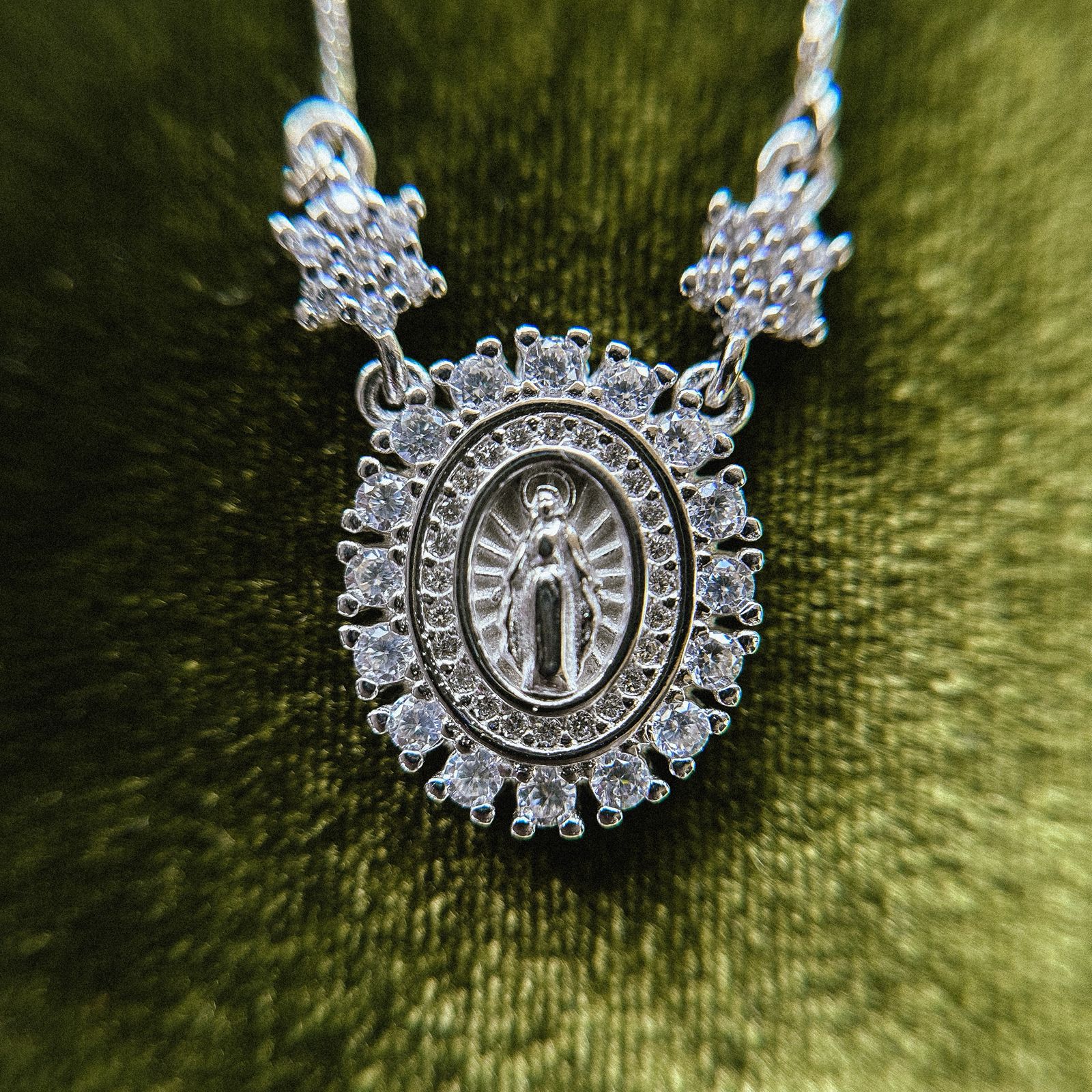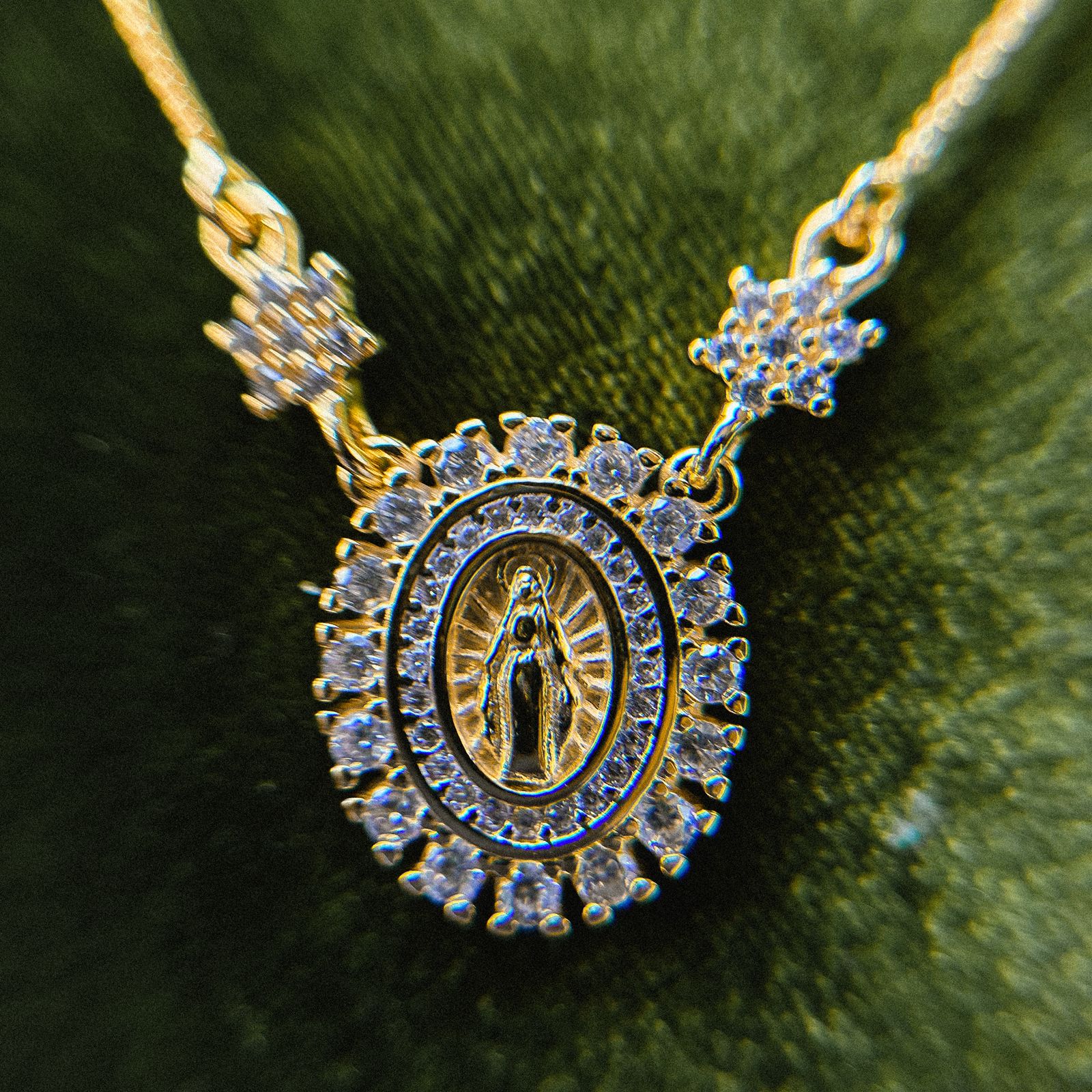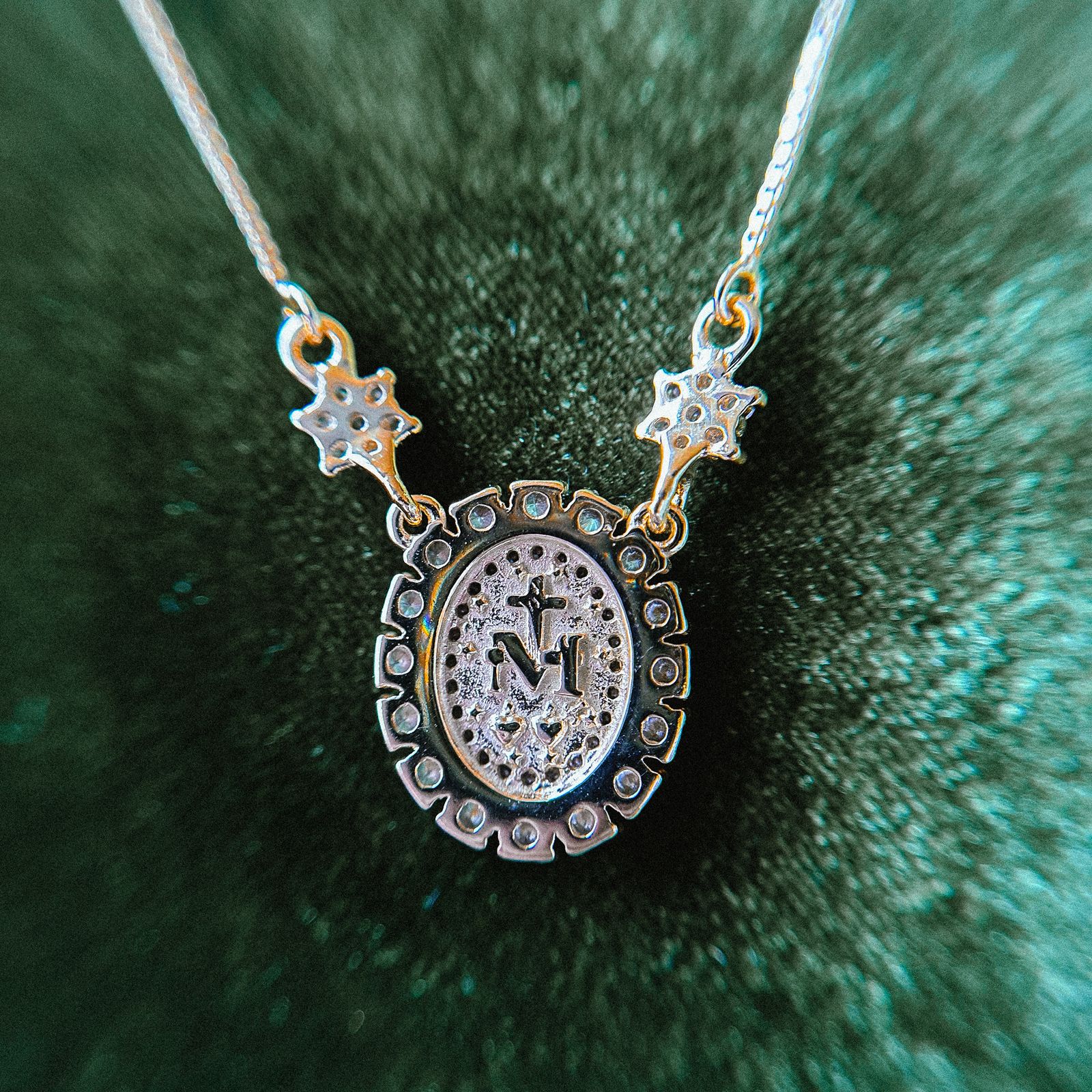 • Moldura oval cravejada com zircônias: cria um halo luminoso ao redor da medalha, valorizando o pingente e elevando o nível da peça.