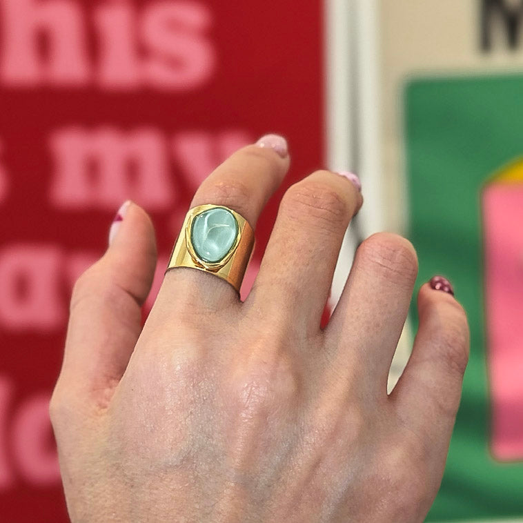 ★ O Anel Lagoa é uma peça statement com personalidade artística. Ele possui aro largo dourado, de superfície lisa e acabamento espelhado, criando um visual sofisticado e moderno. No centro, o destaque absoluto: uma pedra organica em tom verde–água, com efeito translúcido que lembra o brilho suave e profundo de uma lagoa cristalina. A moldura dourada ao redor da pedra tem um acabamento orgânico, trazendo textura e um toque artesanal.