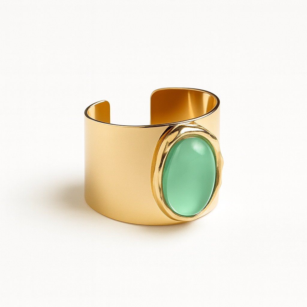 ✔️ Use com looks neutros (preto, branco, bege, jeans) para destacar ainda mais o verde acetinado da pedra, ou combine com peças que tenham elementos naturais, como tecidos fluidos e cores terrosas.