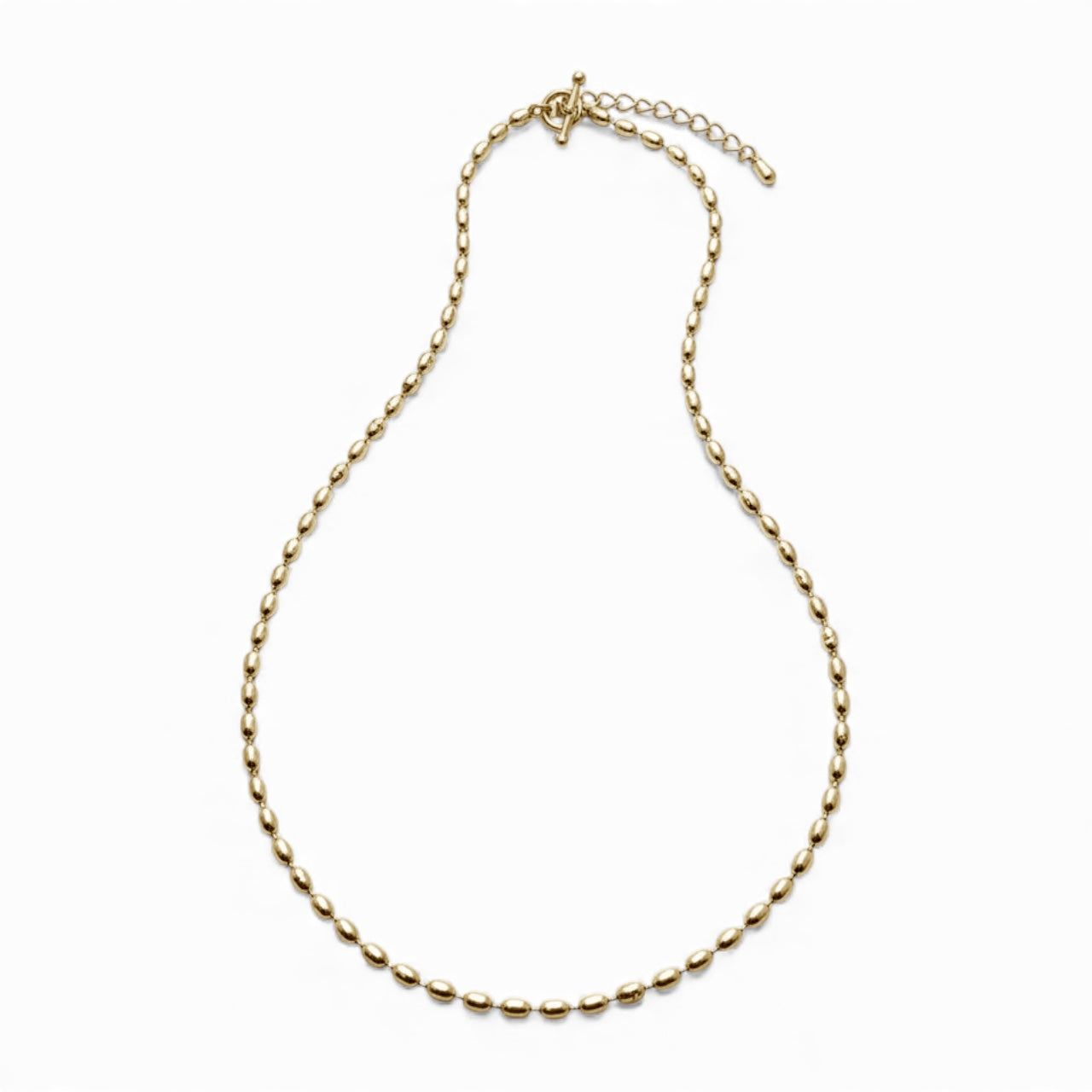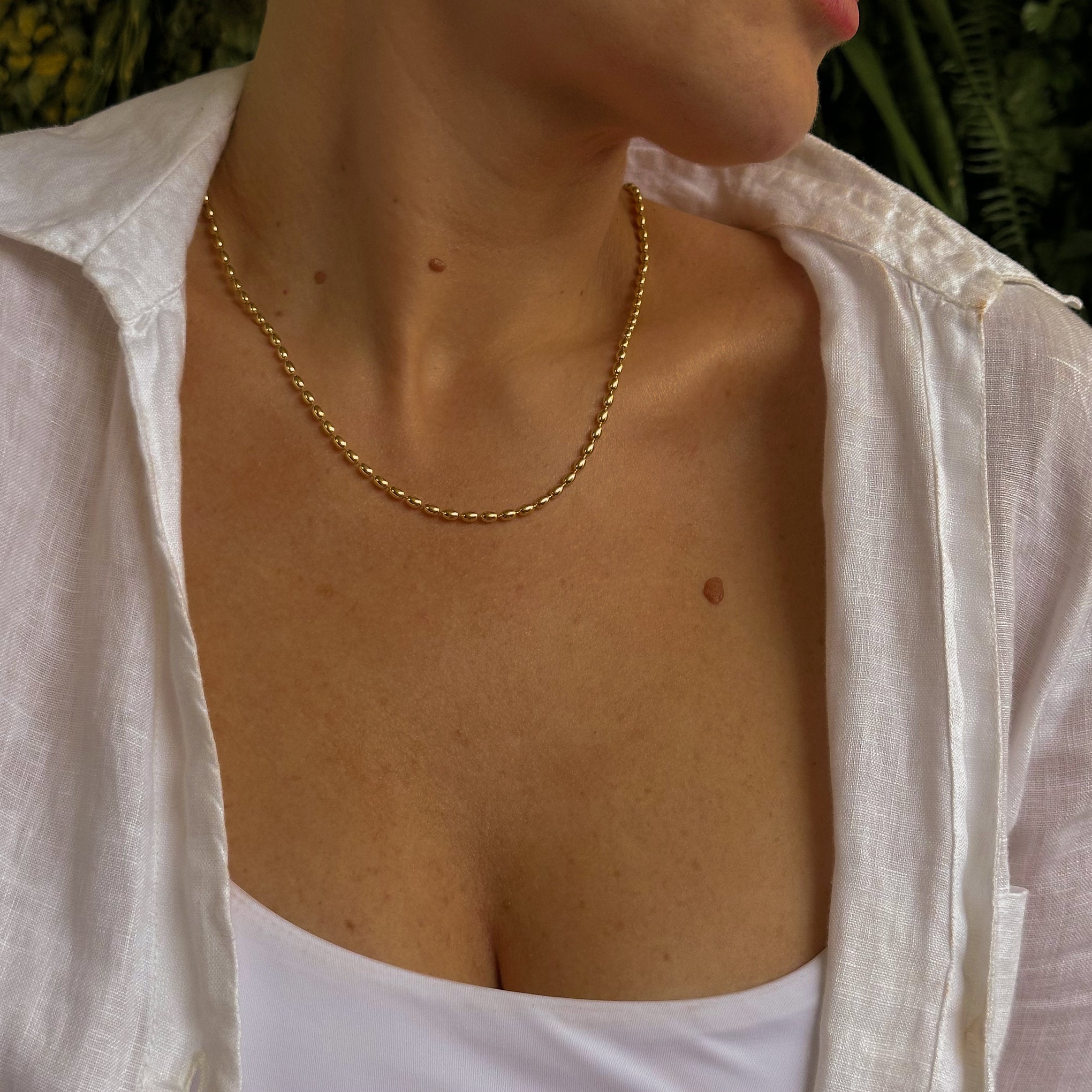 Esse colar é uma corrente dourada de elos arredondados, com acabamento polido e espessura média, pensada para o uso diário com estética elegante e atemporal.