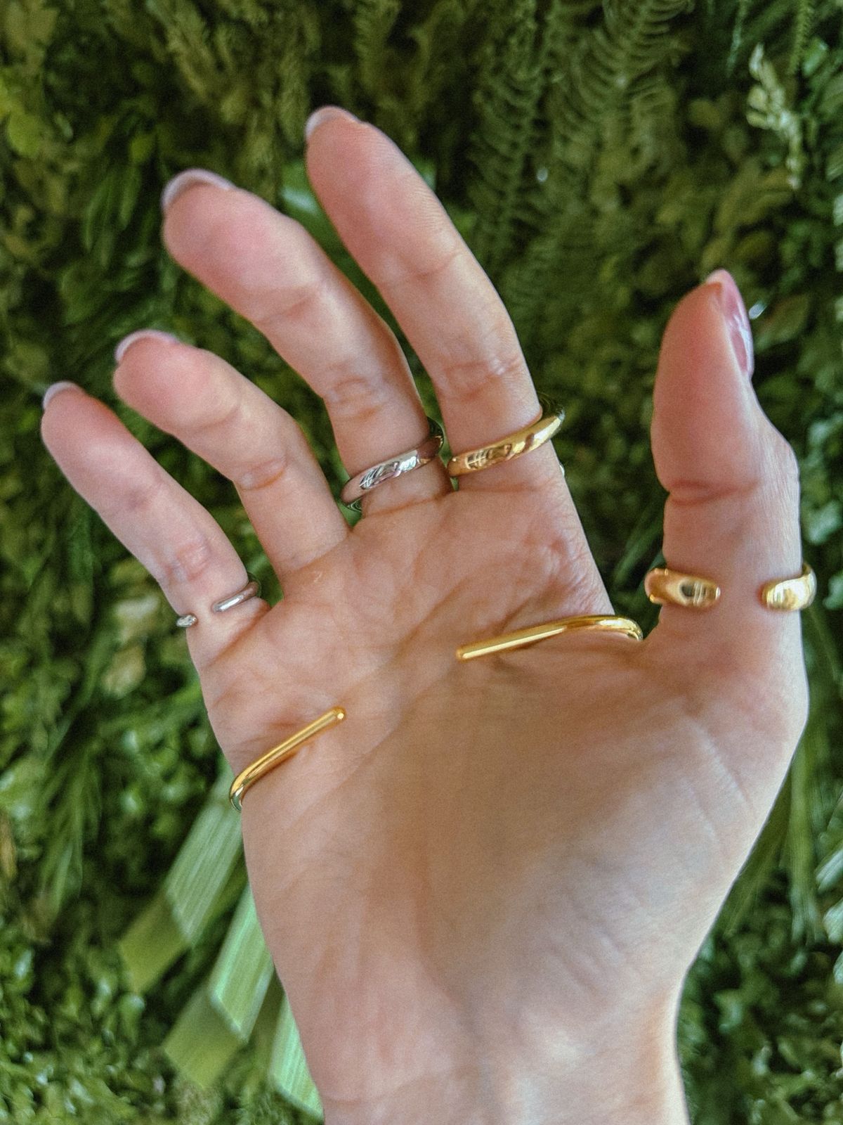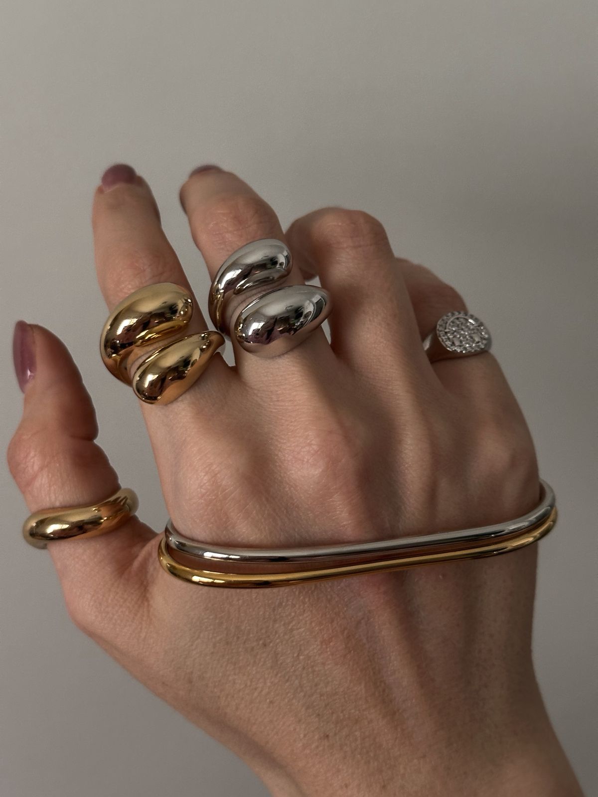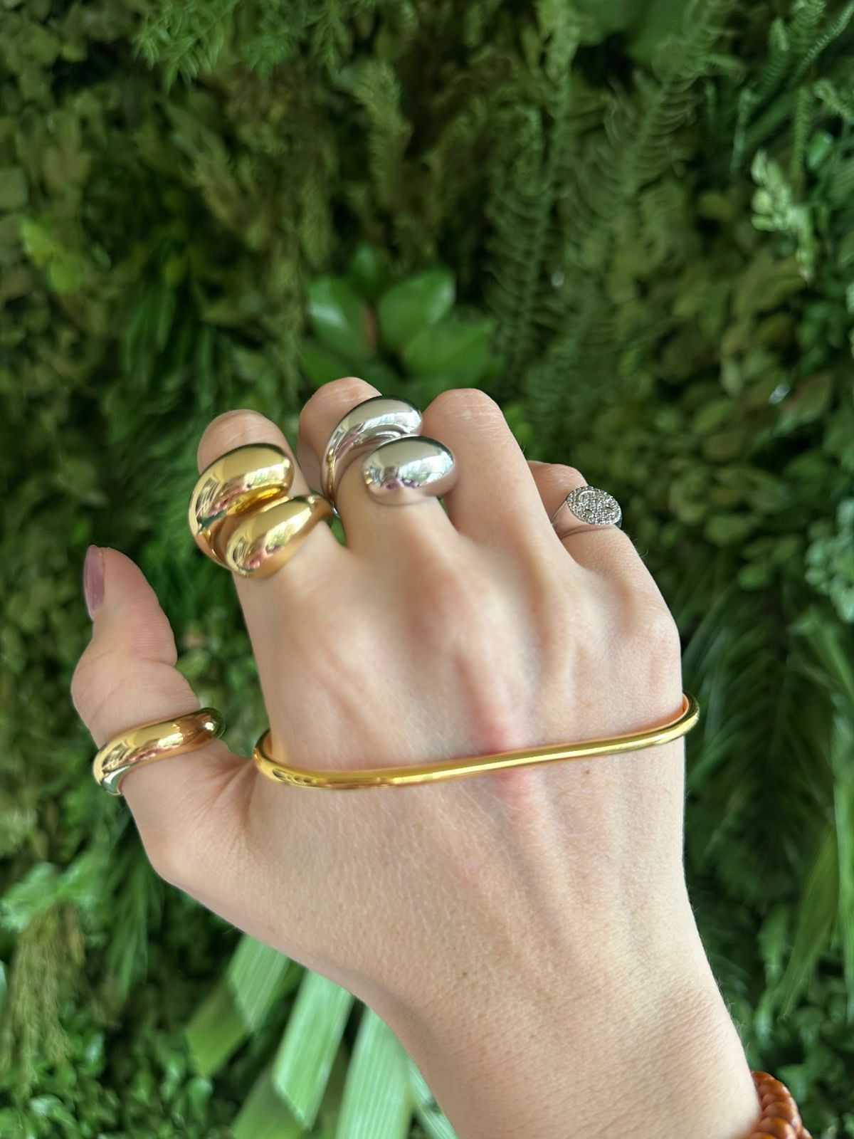O Hand Palm é um acessório contemporâneo e minimalista que percorre a mão de forma orgânica, criando um efeito visual elegante e inesperado. O design em metal polido traz sofisticação imediata, enquanto o formato aberto garante conforto e ajuste natural. É uma peça-statement, moderna, que transforma a mão em ponto focal do look sem precisar de excessos.
